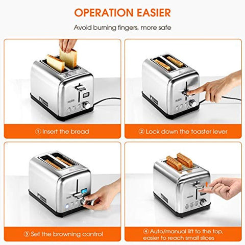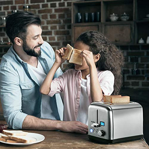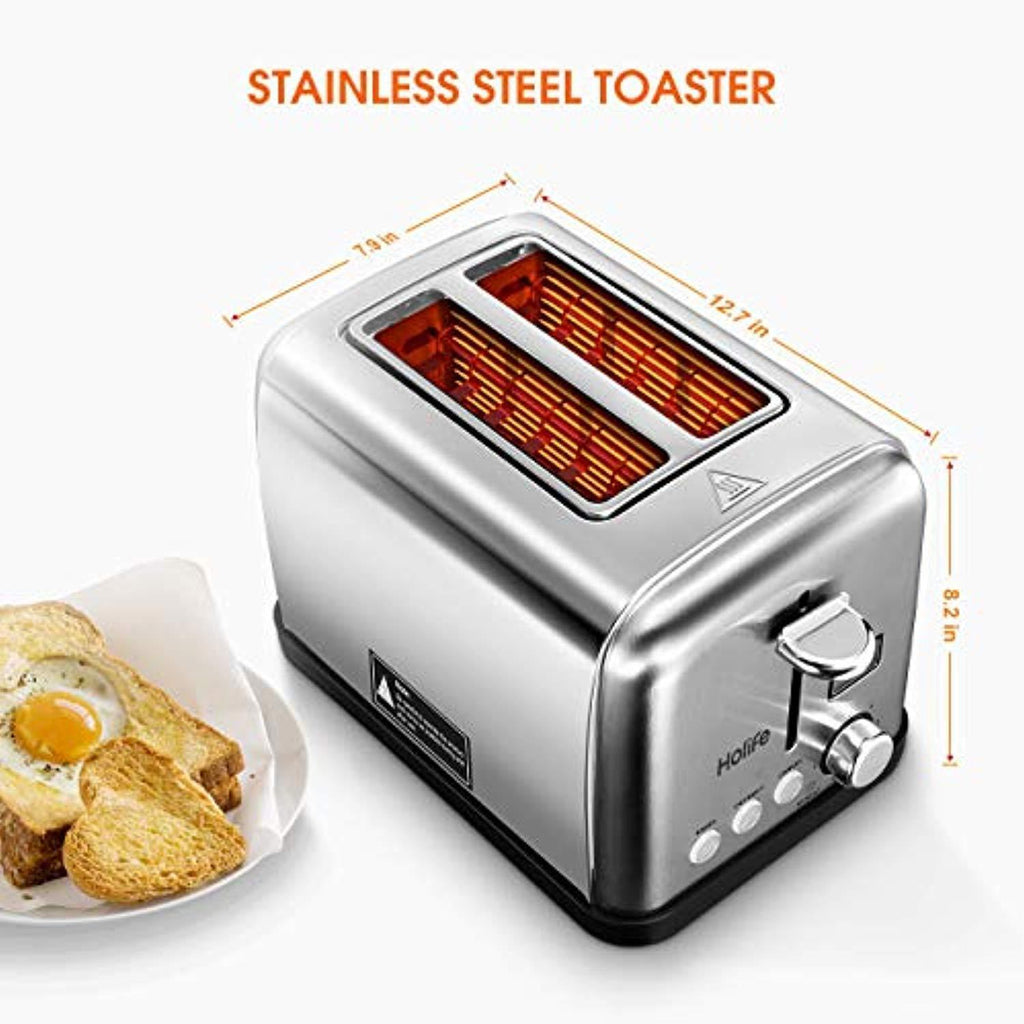 【EXTRA-WIDE 2 SLICE TOASTER】 HOLIFE 2-slice stainless steel toaster featured with 1.5-inch wide slot, making it suitable for various bread types, such as thin waffles or thick artisanal bread. It also equipped with automatic pop up function when the food done.