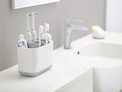 Slim bathroom caddy with 6 storage compartments Ideal for electric toothbrushes, toothpaste, and dental floss Dismantles for easy cleaning Ventilated for quick drying Non-slip feet