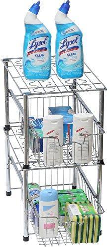 Sliding basket for easy access in limit space and stackable design (Buy two sets and stack them together) No drill, no power tools needed. Just assemble the baskets and save more space Sturdy metal construction with elegant chrome finish